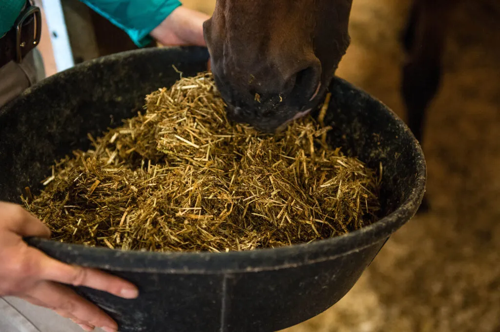 Особое внимание — качеству сена. Поскольку лошадь проводит много времени за едой, именно сено оказывает наибольшее влияние на её дыхательную систему. Избегайте проблемных источников: Рулонные тюки часто накапливают больше плесени и пыли. Для лошадей с астмой лучшим выбором является гранулированное, кубированное сено или сенной травяной корм. Обрабатывайте длинностебельное сено: Если другого варианта нет, обязательно замачивайте или пропаривайте сено. Это эффективно снижает количество вдыхаемых вредных частиц. (Подробнее о пользе обработки сена — ниже).